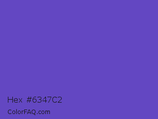 Hex #6347c2 Color is a normal indigo color and the nearest color is Iris #5a4fcf. Hex code #6347c2 and RGB value is rgb(99,71,194). In RGB color space, this color is composed of 39% red, 28% green, 76% blue, In CMYK color space, this color is composed of 49% cyan, 63% magenta, 0% yellow , 24% black , In HSL color space, this color has a hue angle of 254° , 50% saturation and 52% lightness.