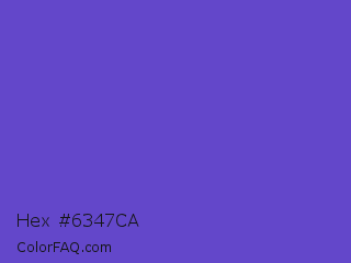 Hex #6347ca Color is a normal indigo color and the nearest color is Iris #5a4fcf. Hex code #6347ca and RGB value is rgb(99,71,202). In RGB color space, this color is composed of 39% red, 28% green, 79% blue, In CMYK color space, this color is composed of 51% cyan, 65% magenta, 0% yellow , 21% black , In HSL color space, this color has a hue angle of 253° , 55% saturation and 54% lightness.