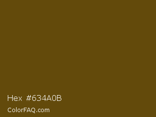 Hex #634a0b Color is a very dark orange color and the nearest color is Horses Neck #604913. Hex code #634a0b and RGB value is rgb(99,74,11). In RGB color space, this color is composed of 39% red, 29% green, 4% blue, In CMYK color space, this color is composed of 0% cyan, 25% magenta, 89% yellow , 61% black , In HSL color space, this color has a hue angle of 43° , 80% saturation and 22% lightness.