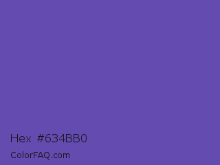 Hex #634bb0 Color is a normal indigo color and the nearest color is Plump Purple #5946b2. Hex code #634bb0 and RGB value is rgb(99,75,176). In RGB color space, this color is composed of 39% red, 29% green, 69% blue, In CMYK color space, this color is composed of 44% cyan, 57% magenta, 0% yellow , 31% black , In HSL color space, this color has a hue angle of 254° , 40% saturation and 49% lightness.