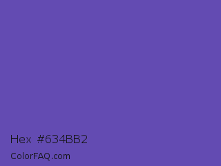 Hex #634bb2 Color is a normal indigo color and the nearest color is Plump Purple #5946b2. Hex code #634bb2 and RGB value is rgb(99,75,178). In RGB color space, this color is composed of 39% red, 29% green, 70% blue, In CMYK color space, this color is composed of 44% cyan, 58% magenta, 0% yellow , 30% black , In HSL color space, this color has a hue angle of 254° , 41% saturation and 50% lightness.