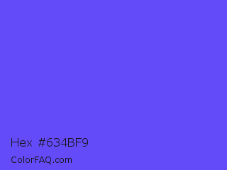 Hex #634bf9 Color is a light indigo color and the nearest color is Very Light Blue #6666ff. Hex code #634bf9 and RGB value is rgb(99,75,249). In RGB color space, this color is composed of 39% red, 29% green, 98% blue, In CMYK color space, this color is composed of 60% cyan, 70% magenta, 0% yellow , 2% black , In HSL color space, this color has a hue angle of 248° , 94% saturation and 64% lightness.