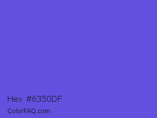 Hex #6350df Color is a normal indigo color and the nearest color is Majorelle Blue #6050dc. Hex code #6350df and RGB value is rgb(99,80,223). In RGB color space, this color is composed of 39% red, 31% green, 87% blue, In CMYK color space, this color is composed of 56% cyan, 64% magenta, 0% yellow , 13% black , In HSL color space, this color has a hue angle of 248° , 69% saturation and 59% lightness.