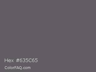 Hex #635c65 Color is a normal purple color and the nearest color is Scorpion #695f62. Hex code #635c65 and RGB value is rgb(99,92,101). In RGB color space, this color is composed of 39% red, 36% green, 40% blue, In CMYK color space, this color is composed of 2% cyan, 9% magenta, 0% yellow , 60% black , In HSL color space, this color has a hue angle of 287° , 5% saturation and 38% lightness.