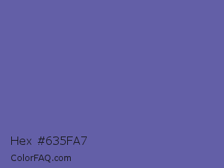 Hex #635fa7 Color is a normal indigo color and the nearest color is Scampi #675fa6. Hex code #635fa7 and RGB value is rgb(99,95,167). In RGB color space, this color is composed of 39% red, 37% green, 65% blue, In CMYK color space, this color is composed of 41% cyan, 43% magenta, 0% yellow , 35% black , In HSL color space, this color has a hue angle of 243° , 29% saturation and 51% lightness.