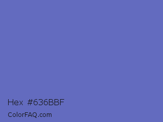 Hex #636bbf Color is a normal blue color and the nearest color is Toolbox #746cc0. Hex code #636bbf and RGB value is rgb(99,107,191). In RGB color space, this color is composed of 39% red, 42% green, 75% blue, In CMYK color space, this color is composed of 48% cyan, 44% magenta, 0% yellow , 25% black , In HSL color space, this color has a hue angle of 235° , 42% saturation and 57% lightness.