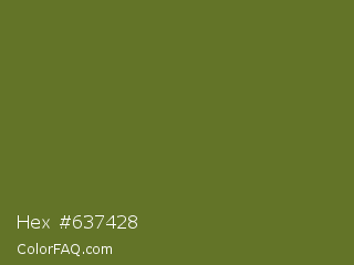 Hex #637428 Color is a normal lime color and the nearest color is Fern Frond #657220. Hex code #637428 and RGB value is rgb(99,116,40). In RGB color space, this color is composed of 39% red, 45% green, 16% blue, In CMYK color space, this color is composed of 15% cyan, 0% magenta, 66% yellow , 55% black , In HSL color space, this color has a hue angle of 73° , 49% saturation and 31% lightness.