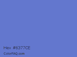 Hex #6377ce Color is a normal blue color and the nearest color is Toolbox #746cc0. Hex code #6377ce and RGB value is rgb(99,119,206). In RGB color space, this color is composed of 39% red, 47% green, 81% blue, In CMYK color space, this color is composed of 52% cyan, 42% magenta, 0% yellow , 19% black , In HSL color space, this color has a hue angle of 229° , 52% saturation and 60% lightness.
