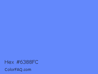 Hex #6388fc Color is a light blue color and the nearest color is Cornflower Blue #6495ed. Hex code #6388fc and RGB value is rgb(99,136,252). In RGB color space, this color is composed of 39% red, 53% green, 99% blue, In CMYK color space, this color is composed of 61% cyan, 46% magenta, 0% yellow , 1% black , In HSL color space, this color has a hue angle of 225° , 96% saturation and 69% lightness.