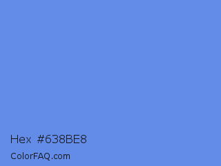 Hex #638be8 Color is a light blue color and the nearest color is United Nations Blue #5b92e5. Hex code #638be8 and RGB value is rgb(99,139,232). In RGB color space, this color is composed of 39% red, 55% green, 91% blue, In CMYK color space, this color is composed of 57% cyan, 40% magenta, 0% yellow , 9% black , In HSL color space, this color has a hue angle of 222° , 74% saturation and 65% lightness.