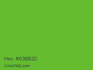 Hex #63bb2d Color is a normal green color and the nearest color is Green RYB #66b032. Hex code #63bb2d and RGB value is rgb(99,187,45). In RGB color space, this color is composed of 39% red, 73% green, 18% blue, In CMYK color space, this color is composed of 47% cyan, 0% magenta, 76% yellow , 27% black , In HSL color space, this color has a hue angle of 97° , 61% saturation and 45% lightness.
