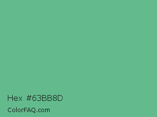 Hex #63bb8d Color is a normal green color and the nearest color is Silver Tree #66b58f. Hex code #63bb8d and RGB value is rgb(99,187,141). In RGB color space, this color is composed of 39% red, 73% green, 55% blue, In CMYK color space, this color is composed of 47% cyan, 0% magenta, 25% yellow , 27% black , In HSL color space, this color has a hue angle of 149° , 39% saturation and 56% lightness.