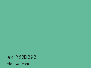 Hex #63bb9b Color is a normal green color and the nearest color is Silver Tree #66b58f. Hex code #63bb9b and RGB value is rgb(99,187,155). In RGB color space, this color is composed of 39% red, 73% green, 61% blue, In CMYK color space, this color is composed of 47% cyan, 0% magenta, 17% yellow , 27% black , In HSL color space, this color has a hue angle of 158° , 39% saturation and 56% lightness.
