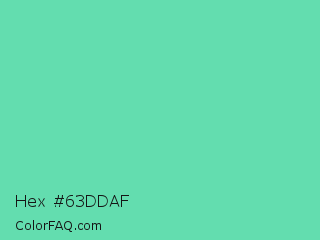 Hex #63ddaf Color is a light green color and the nearest color is Medium Aquamarine #66ddaa. Hex code #63ddaf and RGB value is rgb(99,221,175). In RGB color space, this color is composed of 39% red, 87% green, 69% blue, In CMYK color space, this color is composed of 55% cyan, 0% magenta, 21% yellow , 13% black , In HSL color space, this color has a hue angle of 157° , 64% saturation and 63% lightness.