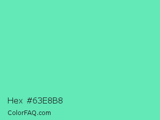 Hex #63e8b8 Color is a light green color and the nearest color is Medium Aquamarine #66ddaa. Hex code #63e8b8 and RGB value is rgb(99,232,184). In RGB color space, this color is composed of 39% red, 91% green, 72% blue, In CMYK color space, this color is composed of 57% cyan, 0% magenta, 21% yellow , 9% black , In HSL color space, this color has a hue angle of 158° , 74% saturation and 65% lightness.