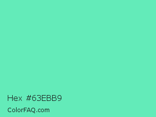 Hex #63ebb9 Color is a light green color and the nearest color is Medium Aquamarine #66ddaa. Hex code #63ebb9 and RGB value is rgb(99,235,185). In RGB color space, this color is composed of 39% red, 92% green, 73% blue, In CMYK color space, this color is composed of 58% cyan, 0% magenta, 21% yellow , 8% black , In HSL color space, this color has a hue angle of 158° , 77% saturation and 65% lightness.