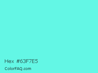 Hex #63f7e5 Color is a light cyan color and the nearest color is Turquoise Blue #6cdae7. Hex code #63f7e5 and RGB value is rgb(99,247,229). In RGB color space, this color is composed of 39% red, 97% green, 90% blue, In CMYK color space, this color is composed of 60% cyan, 0% magenta, 7% yellow , 3% black , In HSL color space, this color has a hue angle of 173° , 90% saturation and 68% lightness.