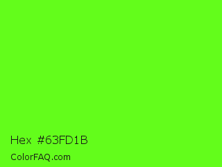 Hex #63fd1b Color is a normal green color and the nearest color is Bright Green #66ff00. Hex code #63fd1b and RGB value is rgb(99,253,27). In RGB color space, this color is composed of 39% red, 99% green, 11% blue, In CMYK color space, this color is composed of 61% cyan, 0% magenta, 89% yellow , 1% black , In HSL color space, this color has a hue angle of 101° , 98% saturation and 55% lightness.