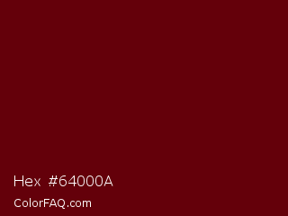 Hex #64000a Color is a very dark red color and the nearest color is Rosewood #65000b. Hex code #64000a and RGB value is rgb(100,0,10). In RGB color space, this color is composed of 39% red, 0% green, 4% blue, In CMYK color space, this color is composed of 0% cyan, 100% magenta, 90% yellow , 61% black , In HSL color space, this color has a hue angle of 354° , 100% saturation and 20% lightness.