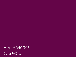 Hex #640548 Color is a very dark magenta color and the nearest color is Pompadour #660045. Hex code #640548 and RGB value is rgb(100,5,72). In RGB color space, this color is composed of 39% red, 2% green, 28% blue, In CMYK color space, this color is composed of 0% cyan, 95% magenta, 28% yellow , 61% black , In HSL color space, this color has a hue angle of 318° , 90% saturation and 21% lightness.