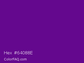 Hex #64088e Color is a dark purple color and the nearest color is Purple #660099. Hex code #64088e and RGB value is rgb(100,8,142). In RGB color space, this color is composed of 39% red, 3% green, 56% blue, In CMYK color space, this color is composed of 30% cyan, 94% magenta, 0% yellow , 44% black , In HSL color space, this color has a hue angle of 281° , 89% saturation and 29% lightness.