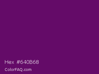 Hex #640b68 Color is a dark magenta color and the nearest color is Honey Flower #4f1c70. Hex code #640b68 and RGB value is rgb(100,11,104). In RGB color space, this color is composed of 39% red, 4% green, 41% blue, In CMYK color space, this color is composed of 4% cyan, 89% magenta, 0% yellow , 59% black , In HSL color space, this color has a hue angle of 297° , 81% saturation and 23% lightness.