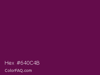 Hex #640c4b Color is a very dark magenta color and the nearest color is Pompadour #660045. Hex code #640c4b and RGB value is rgb(100,12,75). In RGB color space, this color is composed of 39% red, 5% green, 29% blue, In CMYK color space, this color is composed of 0% cyan, 88% magenta, 25% yellow , 61% black , In HSL color space, this color has a hue angle of 317° , 79% saturation and 22% lightness.