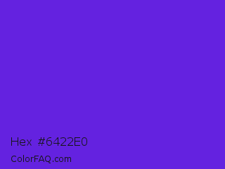 Hex #6422e0 Color is a normal violet color and the nearest color is Purple Heart Crayola #652dc1. Hex code #6422e0 and RGB value is rgb(100,34,224). In RGB color space, this color is composed of 39% red, 13% green, 88% blue, In CMYK color space, this color is composed of 55% cyan, 85% magenta, 0% yellow , 12% black , In HSL color space, this color has a hue angle of 261° , 75% saturation and 51% lightness.
