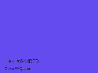 Hex #644bed Color is a light indigo color and the nearest color is Majorelle Blue #6050dc. Hex code #644bed and RGB value is rgb(100,75,237). In RGB color space, this color is composed of 39% red, 29% green, 93% blue, In CMYK color space, this color is composed of 58% cyan, 68% magenta, 0% yellow , 7% black , In HSL color space, this color has a hue angle of 249° , 82% saturation and 61% lightness.