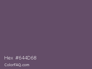 Hex #644d68 Color is a normal purple color and the nearest color is Scarpa Flow #585562. Hex code #644d68 and RGB value is rgb(100,77,104). In RGB color space, this color is composed of 39% red, 30% green, 41% blue, In CMYK color space, this color is composed of 4% cyan, 26% magenta, 0% yellow , 59% black , In HSL color space, this color has a hue angle of 291° , 15% saturation and 35% lightness.