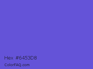 Hex #6453d8 Color is a normal indigo color and the nearest color is Majorelle Blue #6050dc. Hex code #6453d8 and RGB value is rgb(100,83,216). In RGB color space, this color is composed of 39% red, 33% green, 85% blue, In CMYK color space, this color is composed of 54% cyan, 62% magenta, 0% yellow , 15% black , In HSL color space, this color has a hue angle of 248° , 63% saturation and 59% lightness.