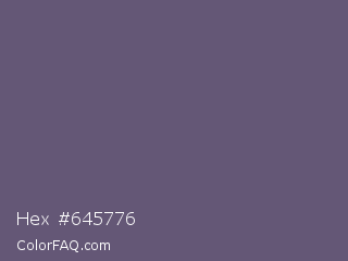 Hex #645776 Color is a normal violet color and the nearest color is Smoky #605b73. Hex code #645776 and RGB value is rgb(100,87,118). In RGB color space, this color is composed of 39% red, 34% green, 46% blue, In CMYK color space, this color is composed of 15% cyan, 26% magenta, 0% yellow , 54% black , In HSL color space, this color has a hue angle of 265° , 15% saturation and 40% lightness.