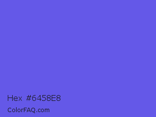 Hex #6458e8 Color is a light indigo color and the nearest color is Majorelle Blue #6050dc. Hex code #6458e8 and RGB value is rgb(100,88,232). In RGB color space, this color is composed of 39% red, 35% green, 91% blue, In CMYK color space, this color is composed of 57% cyan, 62% magenta, 0% yellow , 9% black , In HSL color space, this color has a hue angle of 245° , 76% saturation and 63% lightness.