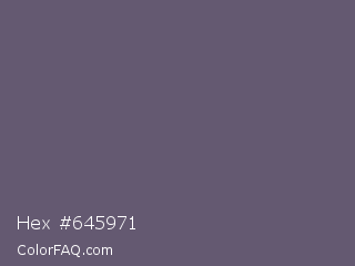 Hex #645971 Color is a normal violet color and the nearest color is Smoky #605b73. Hex code #645971 and RGB value is rgb(100,89,113). In RGB color space, this color is composed of 39% red, 35% green, 44% blue, In CMYK color space, this color is composed of 12% cyan, 21% magenta, 0% yellow , 56% black , In HSL color space, this color has a hue angle of 268° , 12% saturation and 40% lightness.