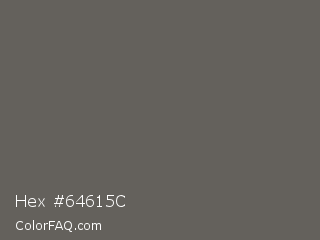 Hex #64615c Color is a normal orange color and the nearest color is Storm Dust #646463. Hex code #64615c and RGB value is rgb(100,97,92). In RGB color space, this color is composed of 39% red, 38% green, 36% blue, In CMYK color space, this color is composed of 0% cyan, 3% magenta, 8% yellow , 61% black , In HSL color space, this color has a hue angle of 38° , 4% saturation and 38% lightness.