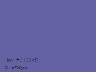 Hex #6462a5 Color is a normal indigo color and the nearest color is Scampi #675fa6. Hex code #6462a5 and RGB value is rgb(100,98,165). In RGB color space, this color is composed of 39% red, 38% green, 65% blue, In CMYK color space, this color is composed of 39% cyan, 41% magenta, 0% yellow , 35% black , In HSL color space, this color has a hue angle of 242° , 27% saturation and 52% lightness.