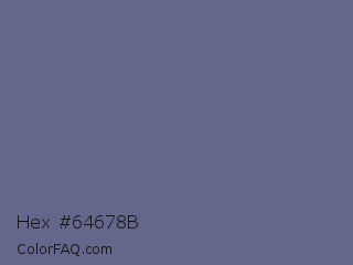 Hex #64678b Color is a normal blue color and the nearest color is Dark Blue Gray #666699. Hex code #64678b and RGB value is rgb(100,103,139). In RGB color space, this color is composed of 39% red, 40% green, 55% blue, In CMYK color space, this color is composed of 28% cyan, 26% magenta, 0% yellow , 45% black , In HSL color space, this color has a hue angle of 235° , 16% saturation and 47% lightness.