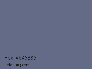 Hex #646b86 Color is a normal blue color and the nearest color is Storm Gray #717486. Hex code #646b86 and RGB value is rgb(100,107,134). In RGB color space, this color is composed of 39% red, 42% green, 53% blue, In CMYK color space, this color is composed of 25% cyan, 20% magenta, 0% yellow , 47% black , In HSL color space, this color has a hue angle of 228° , 15% saturation and 46% lightness.
