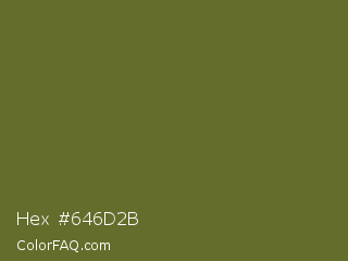 Hex #646d2b Color is a dark yellow color and the nearest color is Fern Frond #657220. Hex code #646d2b and RGB value is rgb(100,109,43). In RGB color space, this color is composed of 39% red, 43% green, 17% blue, In CMYK color space, this color is composed of 8% cyan, 0% magenta, 61% yellow , 57% black , In HSL color space, this color has a hue angle of 68° , 43% saturation and 30% lightness.