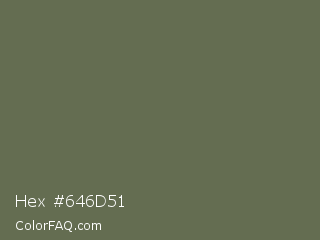 Hex #646d51 Color is a normal lime color and the nearest color is Siam #646a54. Hex code #646d51 and RGB value is rgb(100,109,81). In RGB color space, this color is composed of 39% red, 43% green, 32% blue, In CMYK color space, this color is composed of 8% cyan, 0% magenta, 26% yellow , 57% black , In HSL color space, this color has a hue angle of 79° , 15% saturation and 37% lightness.