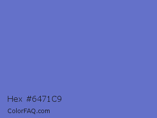 Hex #6471c9 Color is a normal blue color and the nearest color is Toolbox #746cc0. Hex code #6471c9 and RGB value is rgb(100,113,201). In RGB color space, this color is composed of 39% red, 44% green, 79% blue, In CMYK color space, this color is composed of 50% cyan, 44% magenta, 0% yellow , 21% black , In HSL color space, this color has a hue angle of 232° , 48% saturation and 59% lightness.