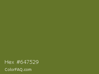 Hex #647529 Color is a normal lime color and the nearest color is Fern Frond #657220. Hex code #647529 and RGB value is rgb(100,117,41). In RGB color space, this color is composed of 39% red, 46% green, 16% blue, In CMYK color space, this color is composed of 15% cyan, 0% magenta, 65% yellow , 54% black , In HSL color space, this color has a hue angle of 73° , 48% saturation and 31% lightness.