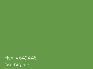Hex #649a48 Color is a normal green color and the nearest color is Palm Leaf #6f9940. Hex code #649a48 and RGB value is rgb(100,154,72). In RGB color space, this color is composed of 39% red, 60% green, 28% blue, In CMYK color space, this color is composed of 35% cyan, 0% magenta, 53% yellow , 40% black , In HSL color space, this color has a hue angle of 100° , 36% saturation and 44% lightness.