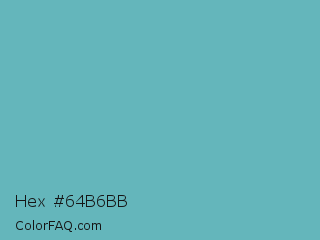 Hex #64b6bb Color is a normal cyan color and the nearest color is Fountain Blue #56b4be. Hex code #64b6bb and RGB value is rgb(100,182,187). In RGB color space, this color is composed of 39% red, 71% green, 73% blue, In CMYK color space, this color is composed of 47% cyan, 3% magenta, 0% yellow , 27% black , In HSL color space, this color has a hue angle of 183° , 39% saturation and 56% lightness.
