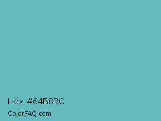Hex #64b8bc Color is a normal cyan color and the nearest color is Fountain Blue #56b4be. Hex code #64b8bc and RGB value is rgb(100,184,188). In RGB color space, this color is composed of 39% red, 72% green, 74% blue, In CMYK color space, this color is composed of 47% cyan, 2% magenta, 0% yellow , 26% black , In HSL color space, this color has a hue angle of 183° , 40% saturation and 56% lightness.