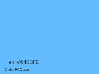 Hex #64bbfe Color is a light blue color and the nearest color is Very Light Azure #74bbfb. Hex code #64bbfe and RGB value is rgb(100,187,254). In RGB color space, this color is composed of 39% red, 73% green, 100% blue, In CMYK color space, this color is composed of 61% cyan, 26% magenta, 0% yellow , 0% black , In HSL color space, this color has a hue angle of 206° , 99% saturation and 69% lightness.