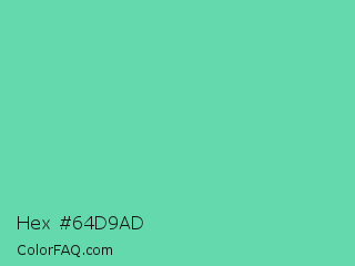 Hex #64d9ad Color is a light green color and the nearest color is Medium Aquamarine #66ddaa. Hex code #64d9ad and RGB value is rgb(100,217,173). In RGB color space, this color is composed of 39% red, 85% green, 68% blue, In CMYK color space, this color is composed of 54% cyan, 0% magenta, 20% yellow , 15% black , In HSL color space, this color has a hue angle of 157° , 61% saturation and 62% lightness.
