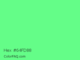 Hex #64fd88 Color is a light green color and the nearest color is Very Light Malachite Green #64e986. Hex code #64fd88 and RGB value is rgb(100,253,136). In RGB color space, this color is composed of 39% red, 99% green, 53% blue, In CMYK color space, this color is composed of 60% cyan, 0% magenta, 46% yellow , 1% black , In HSL color space, this color has a hue angle of 134° , 97% saturation and 69% lightness.