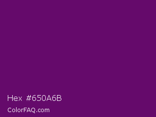 Hex #650a6b Color is a dark magenta color and the nearest color is Honey Flower #4f1c70. Hex code #650a6b and RGB value is rgb(101,10,107). In RGB color space, this color is composed of 40% red, 4% green, 42% blue, In CMYK color space, this color is composed of 6% cyan, 91% magenta, 0% yellow , 58% black , In HSL color space, this color has a hue angle of 296° , 83% saturation and 23% lightness.