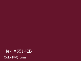 Hex #65142b Color is a dark rose color and the nearest color is Black Rose #67032d. Hex code #65142b and RGB value is rgb(101,20,43). In RGB color space, this color is composed of 40% red, 8% green, 17% blue, In CMYK color space, this color is composed of 0% cyan, 80% magenta, 57% yellow , 60% black , In HSL color space, this color has a hue angle of 343° , 67% saturation and 24% lightness.